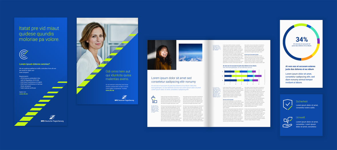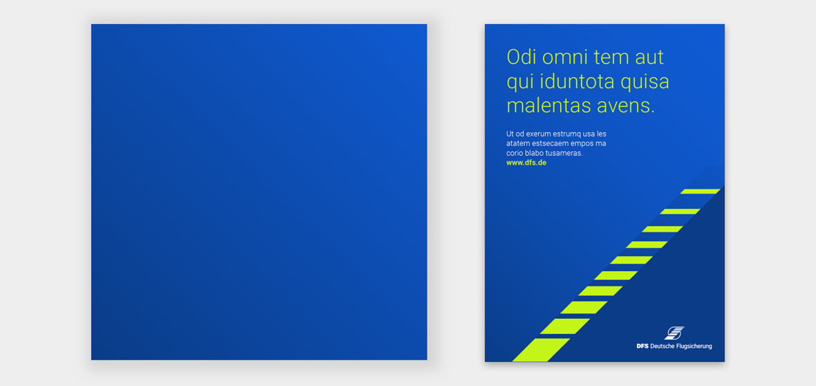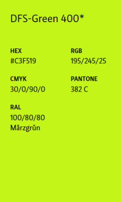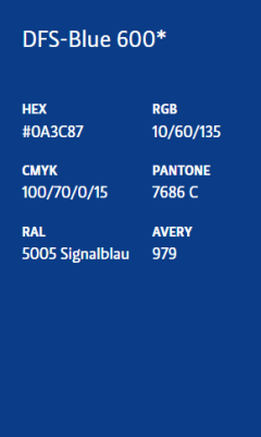 Zwei Primärfarben prägen das visuelle Erscheinungsbild der DFS: DFS-Blue 600 (Pantone 7686 C) und DFS-Green 400 (Pantone 382 C). Beide Farben stehen sowohl in helleren als auch in dunkleren Abstufungen zur Verfügung. Dies ermöglicht eine größere Varianz beim Einsatz in Grafiken, Diagrammen oder digitalen Oberflächen. Sie sind fester Bestandteil jeder Kommunikation. Das DFS-Blue wird plakativ in Flächen eingesetzt, das DFS-Green wird als Akzentfarbe eingesetzt und findet sich in unserem Keyvisual, dem Running-Stripe, wieder.