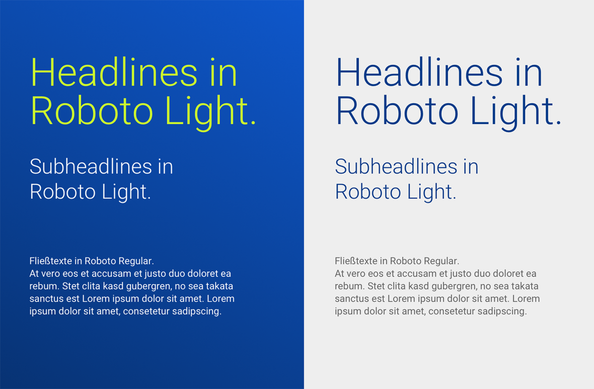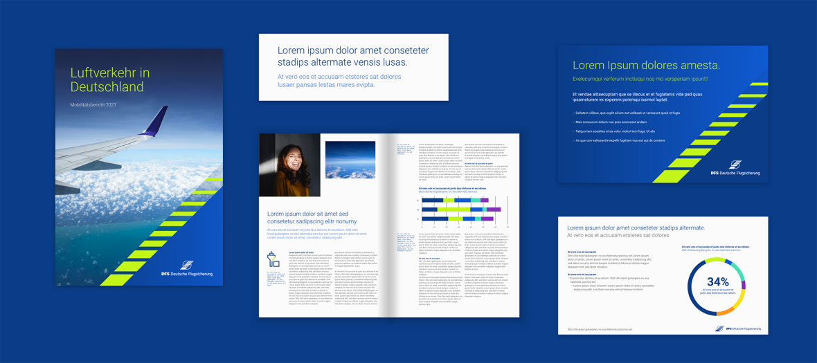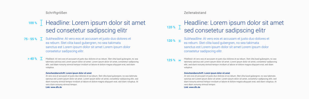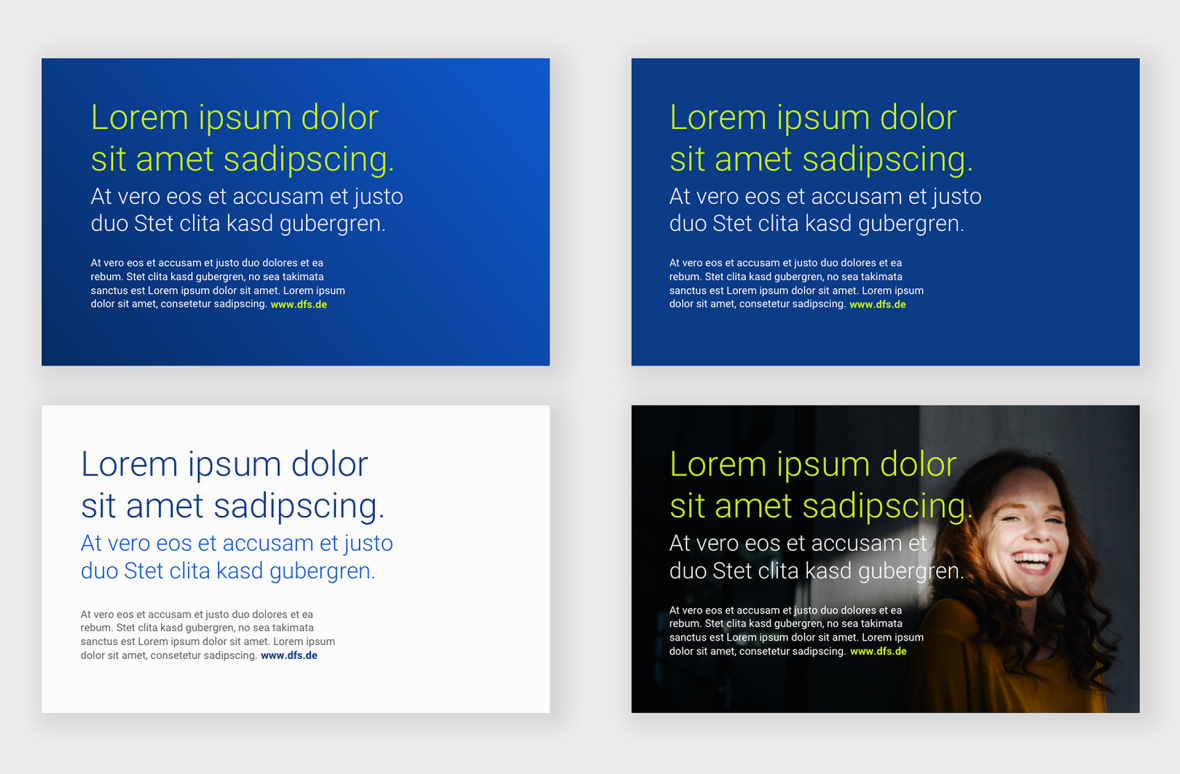 Auf dunklen Bildhintergründen, wie dem DFS-Gradienten, DFS-Blue 600 oder dunklen Bildern, werden Headlines in DFS-Green 400 gesetzt. Copytexte sind weiß. Auf hellen Hintergründen, zum Beispiel auf Broschüren-Innenseiten, werden Headlines in DFS-Blue 600 platziert. Subheadlines können entweder in Light-Blue 600 oder DFS-Blue 600 gesetzt werden. Für Fließtexte wird das DFS-Grey 600 verwendet.