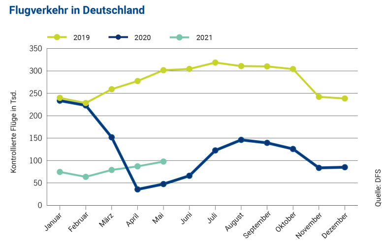 Die Erholung des Luftverkehrs in Deutschland setzt sich fort. Im Mai 2021 zählte die DFS Deutsche Flugsicherung GmbH knapp 98.000 Flugbewegungen im deutschen Luftraum. Für den Sommer und Herbst erwartet die DFS einen weiteren Anstieg.