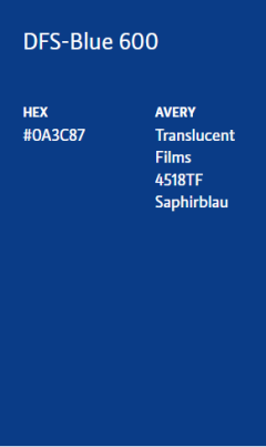 Die Hintergrundfarbe der Stelen ist DFS-Blue 600, die Typografie und Icons werden in Weiß darauf platziert.