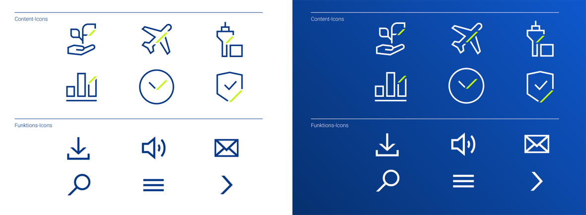 Icons sind grafische Symbole, die ein schnelles Erfassen von Informationen ermöglichen. Insbesondere auf digitalen Benutzeroberflächen schaffen sie Orientierung und tragen neben Logo, Farbe und Schrift zum markentypischen Auftritt der DFS bei.