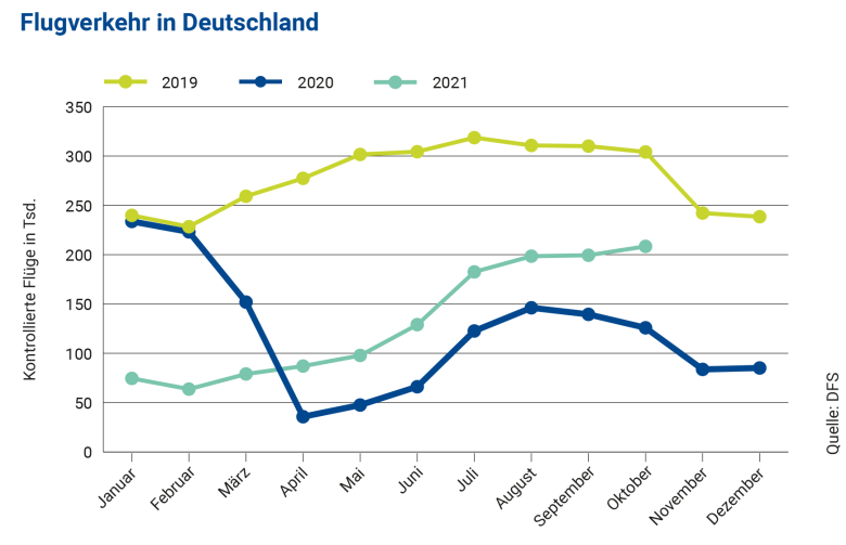 Damit war der Oktober der bislang verkehrsstärkste Monat des Jahres 2021. Diese Entwicklung ist ungewöhnlich: Normalerweise steigt das Verkehrsaufkommen im Jahresverlauf an und erreicht in den Sommermonaten seinen Höhepunkt, um dann von Oktober an wieder zu sinken. Dieser jahrestypische Verkehrsverlauf zeigte sich selbst im Krisenjahr 2020, wenn auch auf niedrigem Niveau.