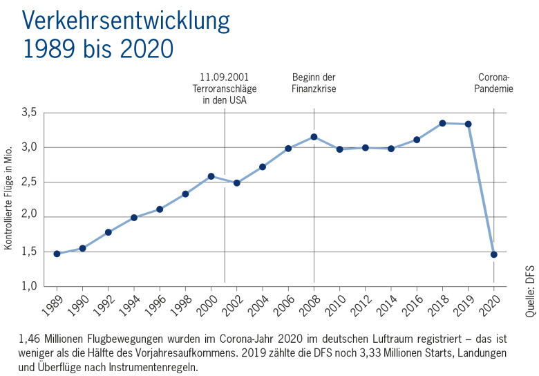 Die DFS Deutsche Flugsicherung hat so wenige Flugzeuge kontrolliert wie noch nie seit ihrer Gründung im Jahr 1993. 2020 wurden im deutschen Luftraum rund 1,46 Millionen Flüge gezählt. Das sind 56,2 Prozent weniger als im Vorjahr, als die Zahl der Flugbewegungen noch bei 3,33 Millionen lag. Das Verkehrsaufkommen in Deutschland ist damit auf das Niveau vor der Wiedervereinigung gesunken: 1989 wurden im Luftraum der Bundesrepublik Deutschland insgesamt 1,47 Millionen Flüge registriert. Seither ist das Verkehrsaufkommen – mit einigen Unterbrechungen – nahezu kontinuierlich gestiegen.