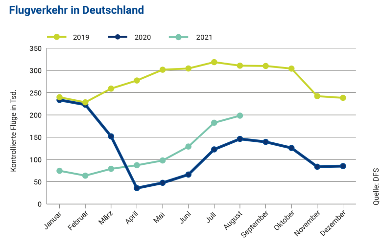 Seit März 2021 erholen sich die Luftverkehrszahlen von der Coronakrise. Nach zögerlichem Beginn wurden in den Sommermonaten Juni und Juli deutliche Verkehrssteigerungen beobachtet. Dieser Trend setzt sich nun auch im August fort. 198.460 Flüge nach Instrumentenflugregeln wurden im deutschen Luftraum gezählt. Damit erreichte das Verkehrsaufkommen im August rund 64 Prozent des Niveaus vor der Krise. Im Juli hatte es, verglichen mit dem Vergleichsmonat 2019, noch bei 57 Prozent und im Juni bei 42 Prozent gelegen.