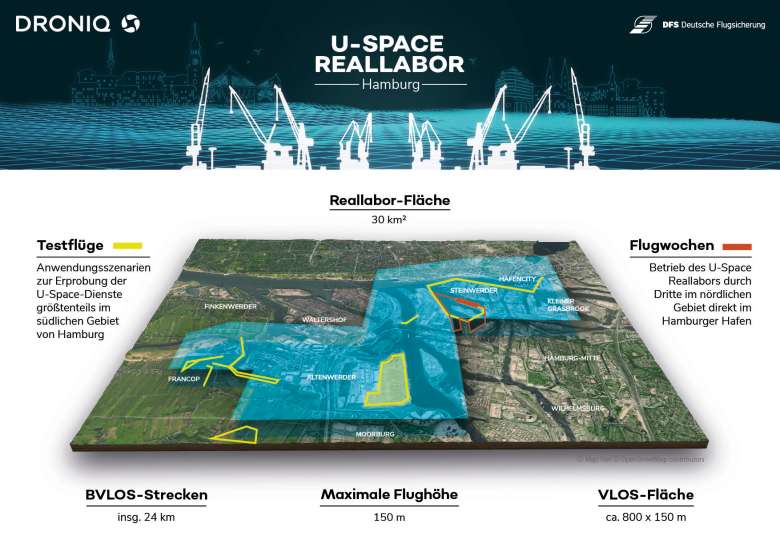 Im U-Space Reallabor Hamburg finden ab Mitte September die ersten Testflüge statt. Ziel des Projekts ist die Förderung der kommerziellen Drohnennutzung in Deutschland. Den Auftakt der Testflüge markierte ein Erstflug über dem Hamburger Hafen. Das Projekt wird von der Droniq GmbH, Deutschlands führendem Unternehmen für die Integration von Drohnen in den Luftraum, und deren Mutterkonzern DFS Deutsche Flugsicherung GmbH umgesetzt und vom Bundesministerium für Verkehr und Digitale Infrastruktur (BMVI) gefördert.