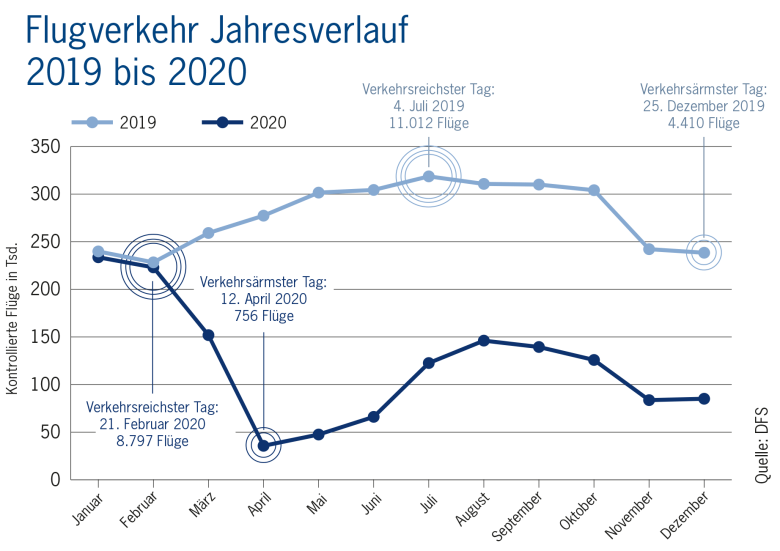 Der Negativ-Rekord, also der verkehrsärmste Tag des Jahres, wurde am Ostersonntag 2020 erreicht. Lediglich 756 Flüge kontrollierten die Fluglotsinnen und Fluglotsen der DFS an diesem Tag im gesamten Luftraum der Bundesrepublik Deutschland. Zum Vergleich: So viele Flugbewegungen verzeichnete allein der Düsseldorfer Flughafen am Spitzentag des Jahres 2019 (754 Flüge); am Frankfurter Flughafen waren es sogar mehr als doppelt so viele (1624 Flüge). Am verkehrsärmsten Tag des Jahres 2019, dem 25. Dezember, hatte die DFS im deutschen Luftraum noch 4.410 Flüge gezählt. Das waren fast sechs Mal so viele wie am Tiefpunkt des Jahres 2020.