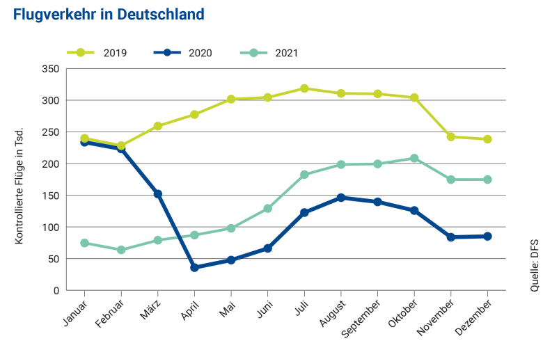 Beim Flugverkehr in Deutschland zeigt sich im zweiten Corona-Krisenjahr ein leichter Aufwärtstrend. Die DFS Deutsche Flugsicherung GmbH registrierte im Jahr 2021 insgesamt 1,67 Millionen Flüge nach Instrumentenflugregeln – mehr als im Vorjahr, aber nur halb so viele wie noch 2019.